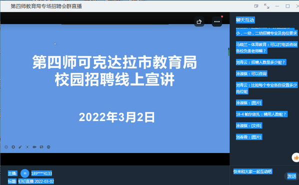 为深入贯彻就业招聘工作有序开展,促进2022届毕业生高质量充分就业,为地州教育系统提供优秀师资,搭建毕业生与用人单位沟通交流平台,2月22日、23日和3月3日,学生就业指导办公室举办了地州教育局云宣讲专场招聘会。本次云宣讲分别邀请了第二师、第四师、第六师教育局,其所辖中小学、幼儿园共提供任教岗位100余个,以数学、语文、英语、体育、音乐等专业为主,共有3300余人次参会。