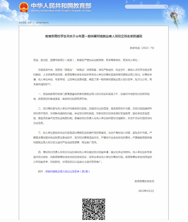 据悉,供需对接就业育人项目今年首次实施,是教育部高校学生司深入贯彻落实党中央、国务院“稳就业”“保就业”决策部署,深化产教融合、校企合作,推动学校人才培养与就业有机联动、人才供需有效对接,经高校申请、用人单位申报、专家审核、立项单位信息核查,确定立项的,由企业提供经费支持。