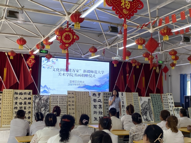 捐赠仪式上,帕力旦·吐尔逊首先对美术学院的捐赠表示感谢,并详细介绍了“文化润疆进万家”活动情况。她强调,学校党委高度重视乡村振兴工作,通过大力推进文化润疆工程助力乡村振兴。“文化润疆进万家”活动是以丰富多彩的文化活动和艺术作品展示为载体,不断满足人民群众对文化生活的新需求、新期待,弘扬中华优秀传统文化,丰富乡村文化生活,提升农民生活品质,增强各族人民群众的精神力量,铸牢中华民族共同体意识,不断提升人民群众的文化获得感、幸福感。李文浩表示,国画、书法是中华优秀传统文化的精髓,蕴含了中华民族丰富的哲学思想、艺术审美和伟大创新精神,是文化认同的最好浸润方式。美术学院开展艺术作品捐赠活动,旨在落实学校党委工作部署,进一步推进文化润疆工程,把铸牢中华民族共同体意识深入基层,扎根群众,积极营造促进民族团结的浓厚氛围,通过艺术赋能乡村振兴。