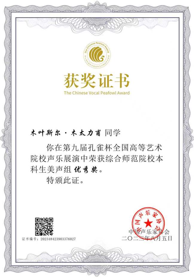 音乐学院教师特日格力指导的学生木叶斯尔·木太力甫荣获综合师范院校美声本科组优秀奖