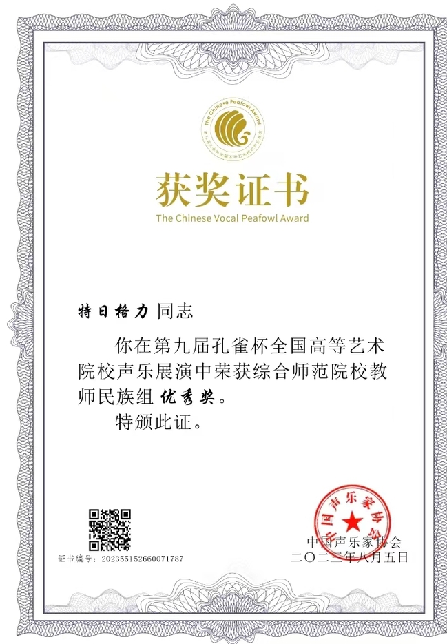 8月5日,第九届孔雀杯高等艺术院校声乐展演活动在浙江音乐学院落下帷幕,音乐学院教师特日格力获得综合院校教师民族组优秀奖;李晓红指导的学生后腾荣获综合师范院校美声本科组金孔雀杯,特日格力指导的学生木叶斯尔·木太力甫荣获综合师范院校美声本科组优秀奖。