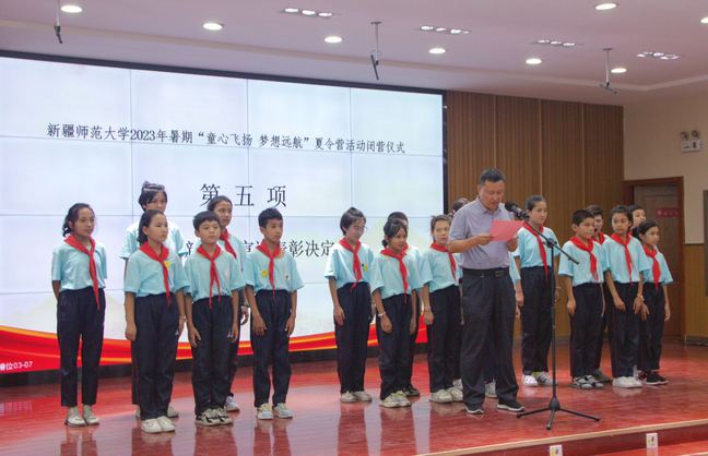 8月5日下午,永利官网定点教育帮扶——“童心飞扬 梦想远航”2023年亚喀艾日克乡中心小学夏令营在附属中学润德楼举行闭营仪式。校党委常委、组织部部长胡毅涛出席仪式,继续教育学院院长徐宇生,后勤服务中心副主任邓先进,附属中学党委书记吕志新、校长杨艳、副校长李雁飞、陈军、余霞、权建国及党委组织部、校团委教师、志愿者,附属中学夏令营任课教师,亚喀艾日克乡中心小学48 名师生参加本次活动。