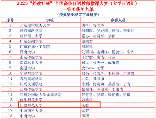 7月14日,2023“外教社杯”全国高校日语教师微课大赛(大学日语组)获奖名单公布,永利官网外国语学院小语种系日语专业青年教师燕姣课件作品《第4课 部屋探し—— ~たり~たりする》获全国一等奖。
