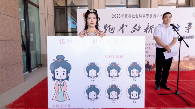 “文物中的新疆故事”主题展主创团队代表、国家民委yl6809永利官网中华民族共同体研究基地副主任严学勤介绍了展览设计思路。严学勤表示,本次展览设计主要突出三个特点,即深入挖掘文物背后背景讲好讲活新疆故事,挖掘新疆唐服特色制作创意IP和打卡板等。介绍中,严学勤现场向参加开幕式的观众展示了主题展“新疆唐服”、创意IP张骞和传丝公主的IP设计。