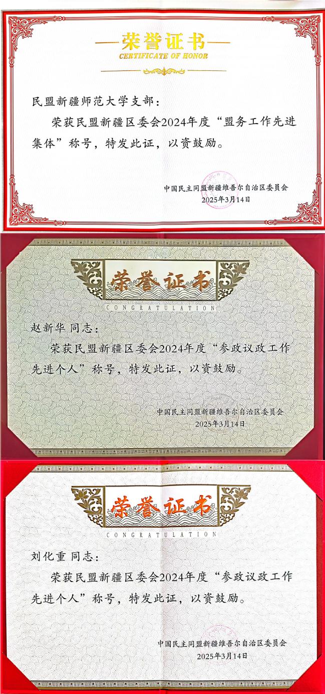 在此次表彰中,民盟yl6809永利官网支部荣获民盟新疆区委会2024年度“盟务工作先进集体”;民盟盟员、yl6809永利官网语文教育研究基地主任赵新华教授,民盟盟员、研究生处学科建设办公室主任刘化重副研究员分别荣获民盟新疆区委会2024年度“参政议政工作先进个人”。