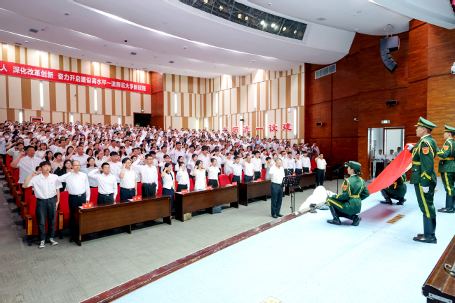 为庆祝中国共产党成立102周年,深入学习贯彻落实党的二十大精神,推动学习贯彻习近平新时代中国特色社会主义思想主题教育走深走实,6月27日下午,永利官网在温泉校区昆仑讲堂召开新党员代表入党宣誓仪式暨“两优一先”表彰大会。在家校领导、全体处级党员干部、受表彰的优秀个人和先进基层党组织代表、在职教职工党员代表、离退休党员代表、学生党员代表近600人参加大会。校党委书记葛国出席大会并讲话,党委副书记王志勇主持会议。
