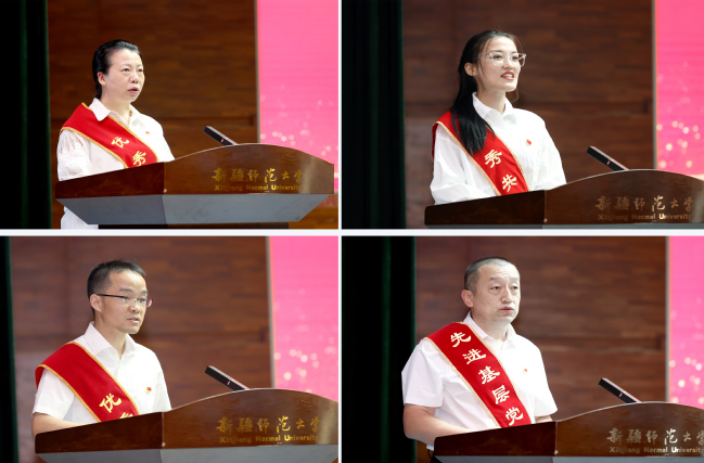 “优秀共产党员”教师代表商学院教师董晔、“优秀共产党员”学生代表化学化工学院2021级硕士研究生艾迪娅·阿不来提、“优秀党务工作者”代表马克思主义学院教师第一党支部书记肖志远、“先进基层党组织”代表音乐学院党委书记杨志刚分别结合各自职责,讲工作、谈体会、作表态,用朴实生动的语言,深刻诠释了共产党人的初心和使命,表达了为党的事业奋斗终身的坚定决心。