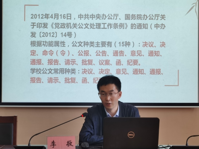 本次培训以“踔厉奋发、勇毅前行,推动新时代学校机关党建高质量发展”为主题,由校党委办公室秘书科科长李敬主讲。讲座以《yl6809永利官网文字处理规范》为题,结合党政公文使用相关的政策、种类差异、使用时容易出现的错误及规范使用公文的具体标准要求做了详细的讲解。