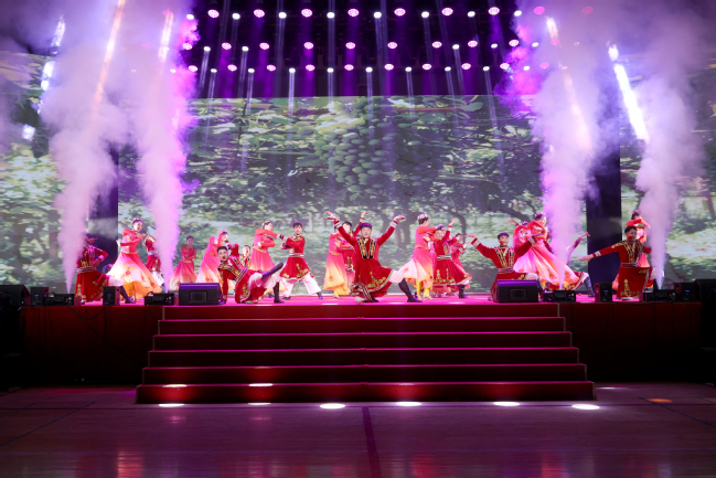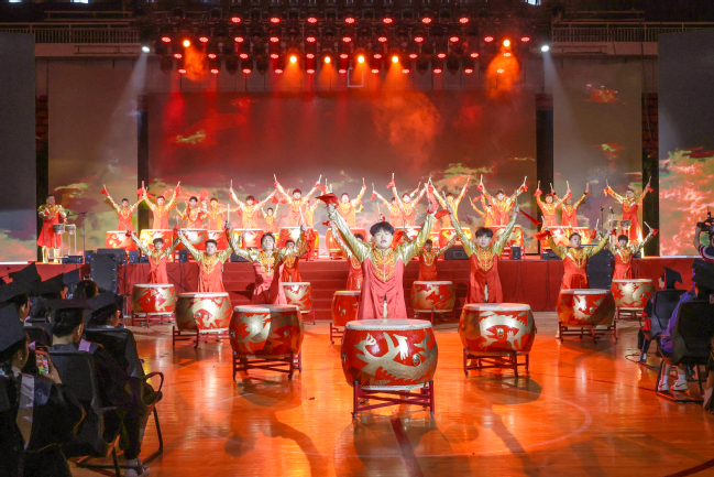 开场击鼓表演《鼓舞中国》气势恢宏,整齐划一、震撼人心的击鼓声响彻体育馆,青春的光芒与激情在此刻绽放,毕业晚会也随之徐徐拉开帷幕。歌曲串烧《稻香》《追光者》《起风了》充分展示当代大学生青春阳光的精神风貌,深情述说岁月的悠长、年华的珍贵。《挥洒青春的汗水》反映了永利官网学子在健美操、拉丁舞等竞技项目中挥洒汗水、奋力拼博的过程。情景剧《相逢是首歌》通过校园情景演绎回顾了四年大学生活的点滴,勾起了现场师生的美好回忆。歌伴舞《为爱干杯》歌词真挚抒情,旋律华彩而欢乐,突出教师亦师亦友的特点,为即将毕业的学子送上最诚挚的祝福。教师代表朗诵《告别的话》,谆谆话语寄情长,既是告别也是祝福。艺术歌曲《怀念战友》浓郁的新疆民歌风情,呈现出新疆地区丰富的音乐文化。手风琴《光和影》以青春为主题,通过欢快明朗的节奏彰显当代青年的热血澎湃、意气风发。明快热烈的《赛乃姆舞蹈表演》将晚会再一次推向高潮,现场欢呼声、掌声不断。晚会临近尾声,终要离别,一曲《如愿》婉转诉尽新师学子对母校的深深眷恋和深情切意。