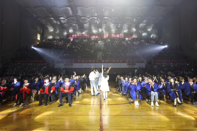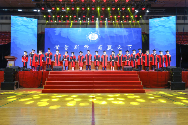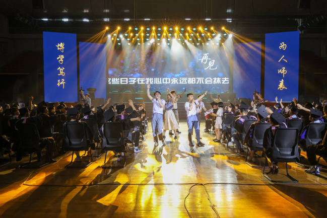 在暖场环节,由辅导员和毕业生代表倾情演唱歌曲《那些年》《再见》《最初的梦想》,用飞扬的歌声拉开典礼序幕。毕业纪念视频和《这里是新师大》循环播放,一帧帧熟悉的画面映入眼帘,毕业生们共同回忆起在学校度过的美好时光。