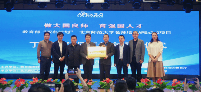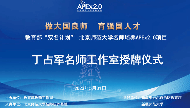 为深入推进学习贯彻习近平新时代中国特色社会主义思想主题教育,造就一批基础教育教育家型教师,培养为学、为事、为人示范的新时代“大先生”,充分发挥名师在基础教育教学改革中的示范、引领和辐射作用,教育部启动了新周期的“双名计划”。5月31日下午,教育部“双名计划”北京师范大学名师培养APEx2.0项目丁占军名师工作室授牌仪式在永利官网附属中学润德楼隆重举行。