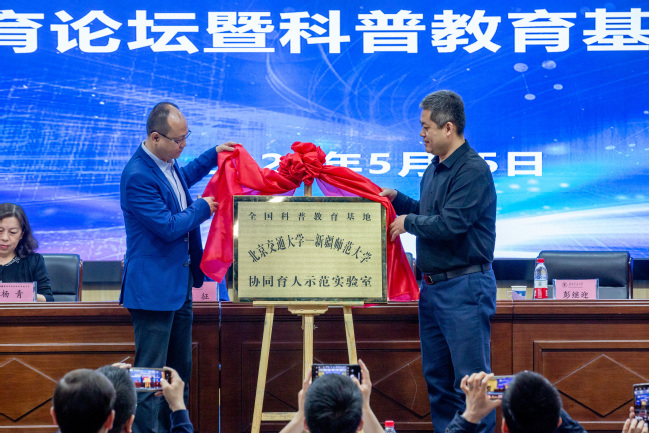 随后,关明、彭继迎共同为全国科普教育基地——北京交通大学·yl6809永利官网协同育人示范实验室揭牌并与参会教师合影。