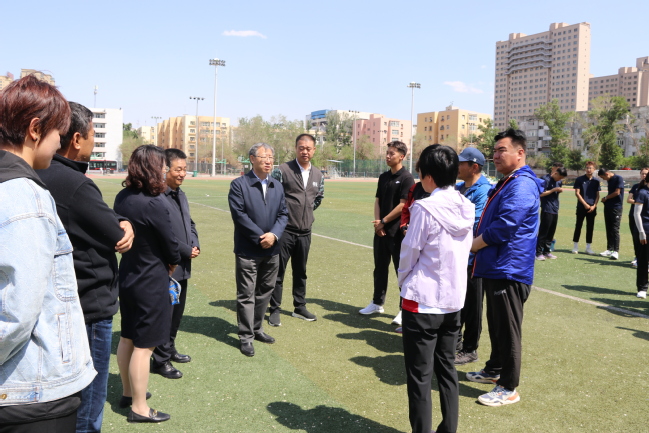 校党委书记葛国在赛前与教练员亲切交谈,询问备赛情况