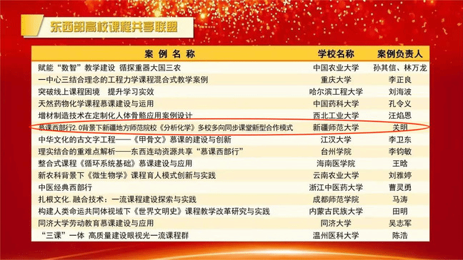 为全面总结中国慕课十年的成就,充分展示我国慕课建设与研究成果,在教育部高等学校教学信息化与教学方法创新指导委员会的指导下,高校在线开放课程联盟于5月13日召开全国慕课教育创新大会(第四届)暨高校在线开放课程联盟联席会2023年会。会议上,全国共遴选出333个“慕课十年典型案例”,永利官网关明教授的《分析化学》课程教学案例作为新疆唯一案例入选。