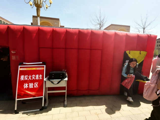 在图书馆门前的小广场,室外科普宣传活动也在如火如荼地进行。新疆蓝天救援队队员现场开展防震避灾、火灾险情逃生技能、紧急心肺复苏抢救、急救包扎术等应急避险自救技巧;国防办及新疆人防协会展示及演示国防人防展板、人防标识标牌实物、消防器材实物,并向师生发放300余份《国防动员宣传手册》及《防灾减灾宣传手册》;新疆消防协会搭起模拟火灾逃生体验屋,师生积极参与,体验在实景中遇火灾时如何正确逃生。
