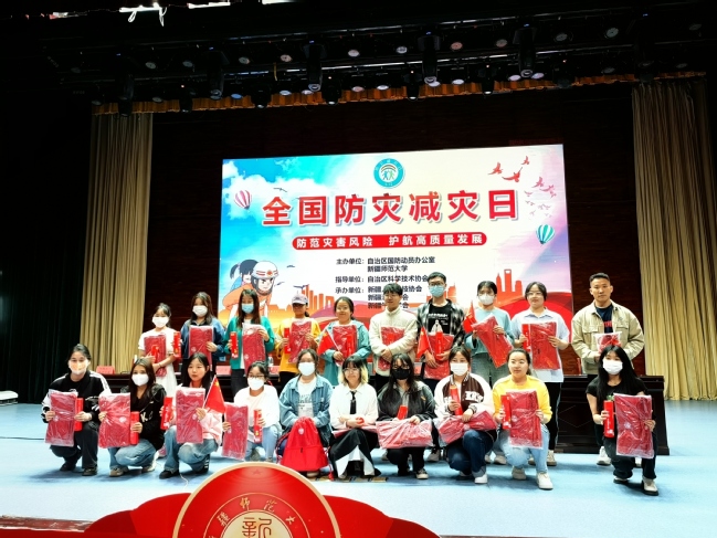 活动中,自治区科协主席海萨尔·夏班拜及自治区国防办副主任杨健分别进行致辞,自治区人防科技专家库鲁鹏轩及新疆卫民安消防教育咨询中心安再尔·艾合买提分别开展了国防知识及消防知识讲座。新疆人防科技协会还组织开展了防灾减灾有奖知识问答,参与活动的同学们积极踊跃地进行抢答。新疆蓝天救援队主任董玉军为同学们讲授防震抗震知识和自救互救方法,并开展了应急疏散演练。最后,在场的师生及各单位工作人员同唱《我和我的祖国》,将活动推向了高潮。