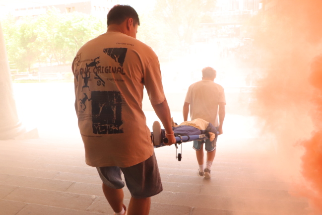 学校党委高度重视安全生产工作,分管文光校区的校党委常委、副校长帕提曼·吐尔逊代表学校党委到现场指挥本次疏散演练。帕提曼·吐尔逊发布演练开始指令,演练现场点燃模拟烟雾、拉响警报器,全体辅导员、校医院医务人员和巡警第一时间赶往现场。学生们在教师的组织下,弯腰并用手护住头部,有序进行疏散,迅速向安全地点撤离,校医院第一时间启动了救援应急预案。