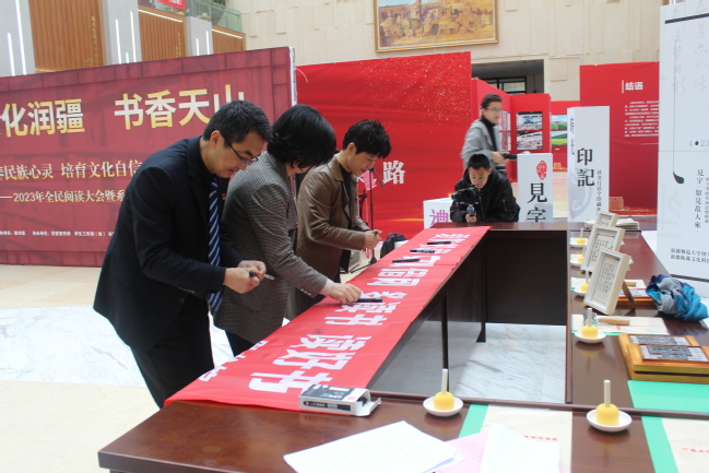 启动仪式上,参会校领导、馆员、读者们共同诵读“中华信仰”系列散文《文化自信》。诵读后,马晓利宣读“争做文明读者”倡议书,读者们在“爱护书籍 文明借阅 多读书读好书”的倡议横幅上踊跃签名,庄重承诺。