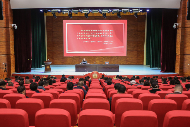 活动中,马克思主义学院副院长罗志佳为与会人员作了题为《马克思主义中国化时代化新的飞跃》的专题讲座,从习近平新时代中国特色社会主义思想的创立、习近平新时代中国特色社会主义思想回答了什么重大时代课题、习近平新时代中国特色社会主义思想主要包含哪些内容、如何把握习近平新时代中国特色社会主义思想的世界观和方法论、何理理解习近平新时代中国特色社会主义思想的历史地位、把握主题教育的总要求学好用好习近平新时代中国特色社会主义思想等六个方面为全体处级干部开展学习辅导。与会人员认真聆听、详细记录,学习氛围浓厚。