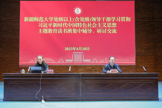 在研讨交流环节,校党委委员、预科教育学院党委书记余东,校纪委委员、党委宣传部副部长、中亚法学研究院院长阿不都米吉提·吾买尔,校图书馆党总支书记、主题教育读书班第二学习小组组长马晓利和政法学院党委书记、主题教育读书班第三学习小组组长唐文睿等4人结合工作实际作了研讨发言、分享学习心得。大家表示,要通过主题教育学习,深刻理解习近平新时代中国特色社会主义思想是当代中国马克思主义、二十一世纪马克思主义、是中华文化和中国精神的时代精华,实现了马克思主义中国化新的飞跃的丰富内涵和深远意义,进而指导工作实践,以实际行动献身中国式现代化建设的新疆篇章。