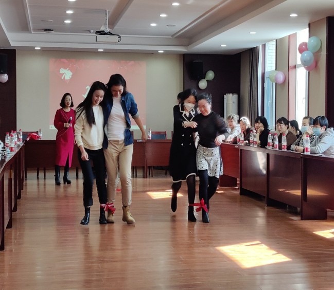 活动第一项为游戏环节,共设有“抢凳子”“你来比划我来猜”“筷递纸杯”“两人三足接力”“猜歌名”“双龙戏珠”六组游戏。女干部们以热情饱满的姿态投入游戏。传统游戏“抢凳子”是大家耳熟能详的游戏,五名游戏者围着三把凳子,伴随音乐的律动转圈,当音乐暂停时,大家忙作一团抢凳子坐,一时间笑声不绝于耳,游戏气氛融洽而热烈。“你来比划我来猜”只能采用肢体语言进行提示,难度较大,但老师们兴趣盎然,许多四字成语在大家搞笑夸张的动作下展现地栩栩如生,现场掌声、笑声不断。“筷递纸杯”游戏充分展现了合作和智慧。随着主持人的一声令下,大家就开始忙活起来,蹲下、起身、找平衡、小心翼翼的用口中的筷子运送纸杯,眼疾手快而又神色自若。观战的老师在一旁不停地指导加油,用手机抓拍下精彩瞬间。“猜歌名”环节中每一首歌曲的音符落下,都让大家重拾青葱岁月,每一句歌词都透露青春的情怀,让人意犹未尽。昂扬向上的拼搏精神,团结一致的团队意识在“两人三足接力”和“双龙戏珠”游戏中被表现地淋漓尽致。比赛过程紧张激烈又妙趣横生,现场热闹非凡、气氛活跃。
