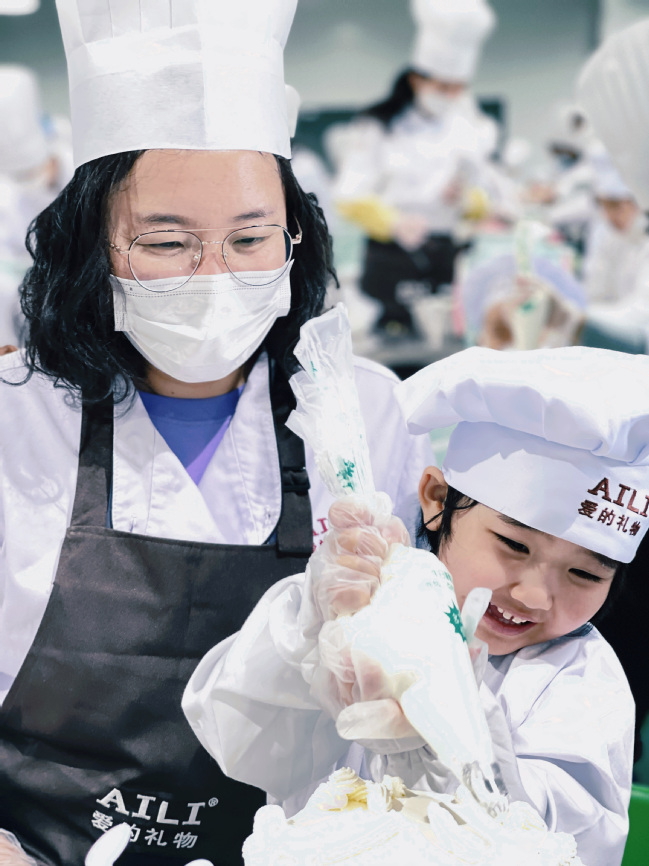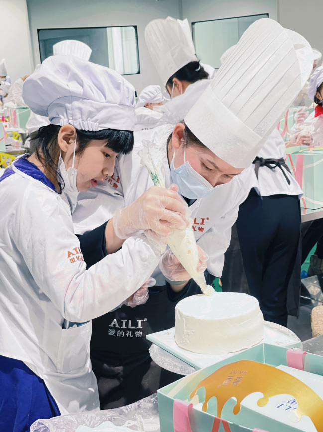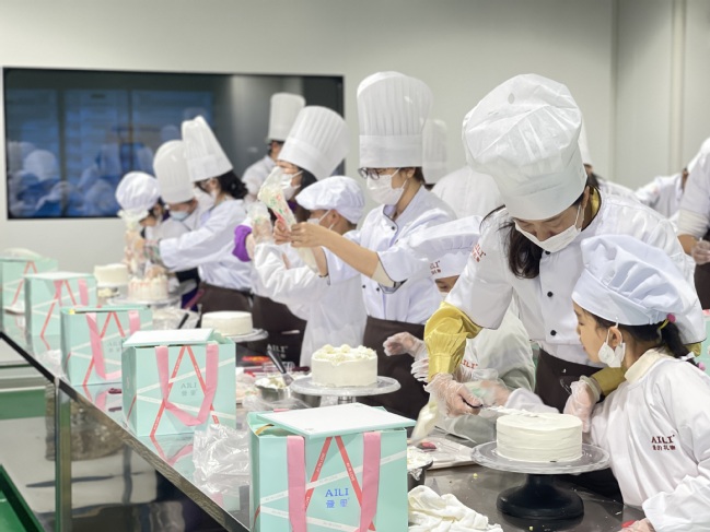 随后进入烘培环节。在工作人员引导下,大家穿上专用工作服,进行规范的净化、消毒后,有序进入蛋糕制作间。孩子们一人一个制作台,随着专业蛋糕师的讲解,专注地和妈妈一起探索、创作:抹面、裱花、巧克力插片、水果造型、题字……有的家庭手忙脚乱,有的家庭有条不紊,现场洋溢着暖暖的爱意和欢乐,每一帧画面都饱含温馨与幸福。完成蛋糕制作后,女教职工和孩子们还参观了工厂流水线,最后领取了自己制作的创意蛋糕。