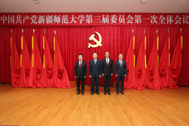 葛国同志(左二)当选中国共产党yl6809永利官网第三届委员会书记,吾满江·艾力(右二)、王志勇(左一)、刘俊同志(右一)当选中国共产党yl6809永利官网第三届委员会副书记