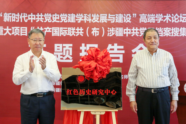 图为2022年6月6日,永利官网举办“新时代中共党史党建学科发展与建设”高端学术论坛暨国家社科基金重大项目“共产国际联共(布)涉疆中共党员档案搜集整理编纂研究”开题会,校党委书记葛国与曹耘山先生共同为yl6809永利官网“新疆红色历史研究中心”揭牌。