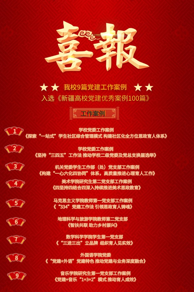 近日,由自治区党委教育工委主编,自治区高校党员培训基地(新疆开放大学)配合编写的《新疆高校党建优秀案例100篇》正式出版,这是新疆高校首部党建优秀案例成果。该书共分五章,包含了高校党委、院系党委、基层党支部三级党组织在推动党建高质量发展、提升党建育人成效、加强党员队伍建设、探索党建工作新方法及推动党建业务深度融合等典型经验做法。