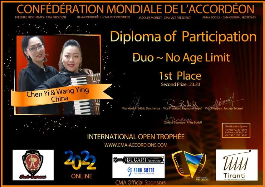 陈怡、王颖荣获第72届世界手风琴锦标赛公开大奖赛14C组第一名