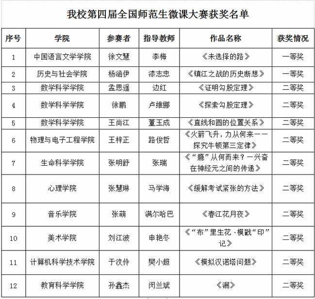 2023年1月4日,由教育部陕西师范大学基础教育课程研究中心、西部师范大学教师教育创新与发展联盟联合主办的第四届全国师范生微课大赛获奖名单揭晓。永利官网推荐的20项作品共12项获奖,其中一等奖2项、二等奖10项,学校荣获优秀组织单位。第四届全国师范生微课大赛历经院校初赛、全国复赛网络专家评审、专家终审,全国共有162所师范院校2703个作品入围决赛。此次比赛进一步提升了永利官网师范生信息化教学能力和信息素养,提高了应用信息技术优化学科课堂教学的方法技能,促进了信息技术与教育教学的深度融合。今后,学校将进一步提升学生信息化教学能力,加快创新型卓越教师培养,不断提高人才培养质量。