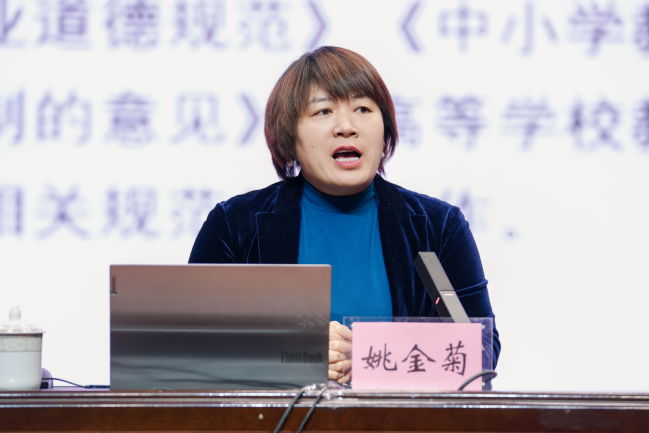 培训中,姚金菊教授关于《高校教师职业法律风险防范》的讲座,对教师法律地位、资格制度及权利义务进行了深入浅出地解读,帮助教师依法明事、护身、爱生、执教。廖红教授讲授题为《数字化背景下课程思政建设的思考与实践》的讲座,结合自身多年一线教学经验和全国高校教师教学创新大赛的参赛获奖经历,分享了对于“以学生为中心”教育理念、教学内容重构与融合、课程思政等方面的深度思考和实践成效。王郢教授围绕《以育人效果评价推进教学改革创新——探索与思考》主题,从课程思政元素有哪些、课程思政如何融入以及课程思政育人效果如何评价三个方面,分享了大量的实践案例。卢江副教授以《面向深度学习的交互式教学设计与课堂综合教学能力提升》为题,基于相关理论知识,阐述了如何通过创新的教学设计来提升教师的教学能力。