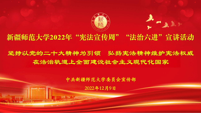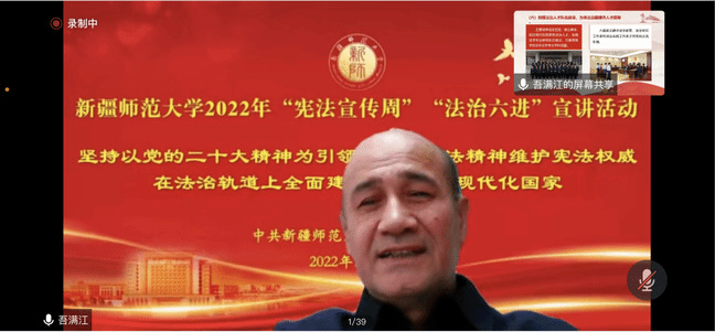 今年12月4日是第九个国家宪法日,也是我国现行宪法公布施行40周年。为深入贯彻落实党的二十大精神,深入学习习近平法治思想,切实加强宪法宣传学习,弘扬宪法精神,维护宪法权威,提升师生法治意识。根据自治区党委宣传部、自治区党委全面依法治疆办统一安排部署,12月9日上午,永利官网举行了2022年“宪法宣传周”“法治六进”线上宣讲活动。校党委副书记、校长吾满江·艾力为师生作了题为《坚持以党的二十大精神为引领,弘扬宪法精神 维护宪法权威,在法治轨道上全面建设社会主义现代化国家》的宣讲。校党委常委、宣传部部长高靖主持宣讲。各学院书记、副书记、辅导员、团学干部300余人聆听宣讲。