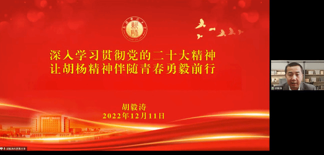 为进一步学习宣传贯彻党的二十大精神,全面学习领会习近平新时代中国特色社会主义思想,引领学生党员紧密团结在党中央周围,深化理论学习,筑牢信仰根基,切实增强使命感、责任感,12月10日,校党委常委、组织部部长胡毅涛通过线上腾讯会议的形式为38名“胡杨先锋”学生党员开展题为《深入学习贯彻党的二十大精神 让胡杨精神伴随青春勇毅前行》的党课。