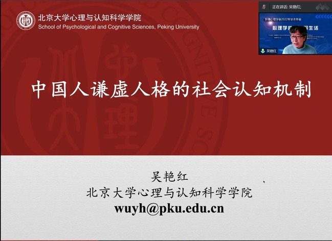 在学术年会特邀报告环节,华东师范大学心理与认知科学学院周晓林教授作题为《自主选择促进行为反应与控制》的报告。报告从研究背景、自主选择促进行为与控制、结论三个方面进行,用13个行为实验探究了自主选择对行为的影响,回答了自主选择影响个体行为表现的方式、相应认知加工的具体层次以及制约因素。北京大学心理与认知科学学院吴艳红教授以《中国人谦虚人格的社会认知机制》为题进行了分享。她从谦虚人格的社会认知特征出发,探讨了他人对谦虚者的印象以及谦虚者的自我印象,阐明了谦虚人格对心理健康产生的影响机制及谦虚影响社会交往的认知神经机制。