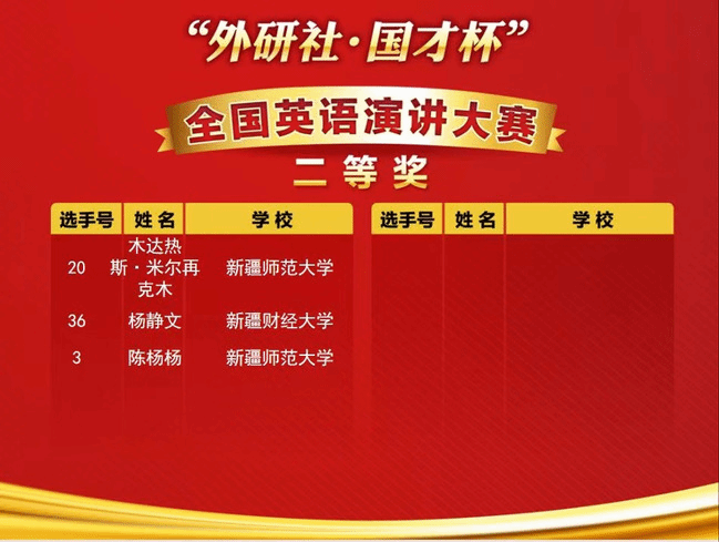由新疆维吾尔自治区教育厅、新疆高校外语教学研究会、北京外语教学与研究出版社主办,新疆大学承办的2022年“外研社·国才杯”全国英语演讲、阅读、写作大赛新疆赛区复赛于11月5日(星期六)成功在线上举办。