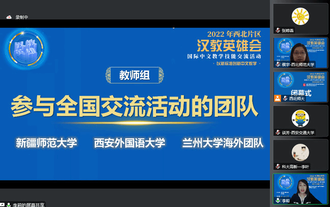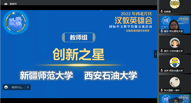 “汉教英雄会”是教育部中外语言交流合作中心主办的国际中文教师教学交流活动,全国共分为六大片区展开,近年来已成为国际中文教育界的一项盛事。永利官网首次参加并取得西北片区第一名的优异成绩,充分展现了国际文化交流学院教师良好的教学技能和深厚的中华文化底蕴。