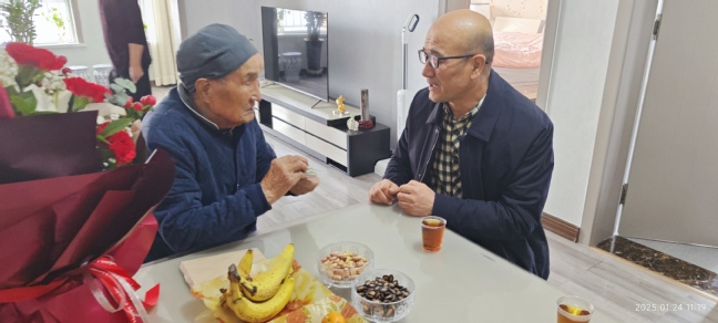 根据安排,校党委副书记、校长吾满江·艾力,校党委副书记王志勇也分别看望慰问了多位老同志。在原副校长张梦麟的家中,看到张梦麟身体健康、精神矍铄,吾满江·艾力十分高兴,仔细询问了张梦麟的饮食起居和日常娱乐活动,叮嘱鼓励老同志保重身体,享受生活。王志勇在慰问中与老同志及其家属亲切交谈,详细了解他们的身体状况和生活需求,鼓励他们保持乐观心态,并为他们送上新春祝福。