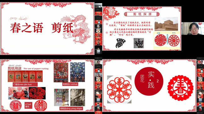 仪式上,永利官网国际文化交流学院张婷燕老师为大家带来了精彩的第一堂课——“中华剪纸艺术”,课程详细介绍了剪纸的历史渊源、艺术特色及制作技巧,通过生动的讲解和细致的演示,营员手中的剪刀在彩纸上轻盈飞舞,一个个“春”字活跃地展现在各自的屏幕上。