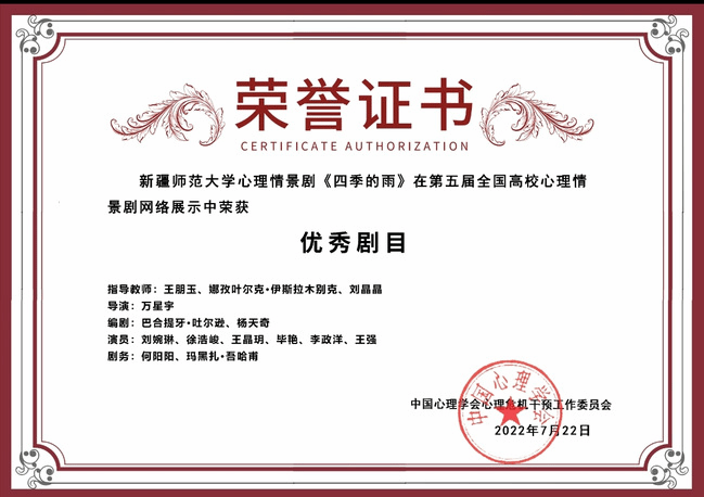 获奖作品《四季的雨》此前荣获永利官网第十一届校园心理情景剧大赛一等奖的好成绩。此剧由王朋玉、娜孜叶尔克·伊斯拉木别克、刘晶晶指导,万星宇导演,刘婉琳等同学演绎,作品主要讲述新生小雨在恋爱中自我成长的故事。此次国赛,全国共有280余所高校作品入围,视频作品经过委员会评选,永利官网作品在全国网络平台进行展播,经过激烈的投票和评选环节,最终荣获优秀剧目奖。