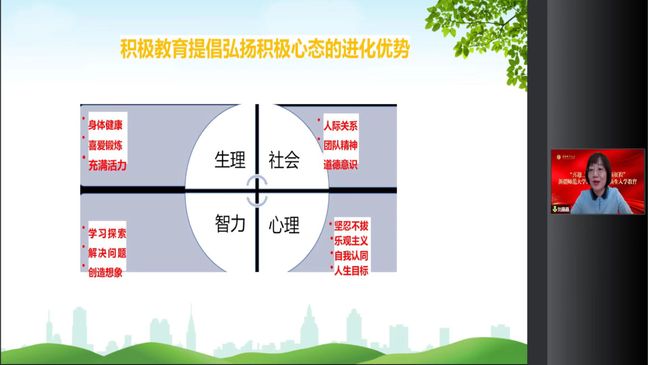 学生工作部(处)心理健康教育服务中心教师刘晶晶从“什么是美好生活”“养成积极心态”“适应新身份”三个方面入手,通过云端互动、知识讲解、案例解析等方式分析大学生面临的心理危机,鼓励新生正确面对心理压力和情绪困扰,引导新生打开心理世界的大门,助力健康成长与发展进步。