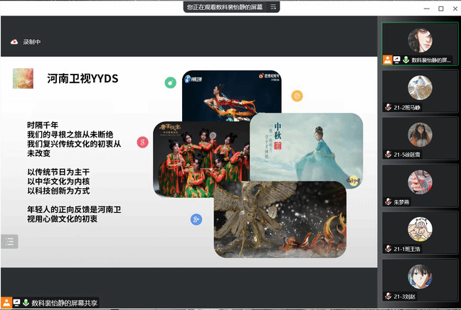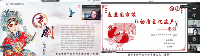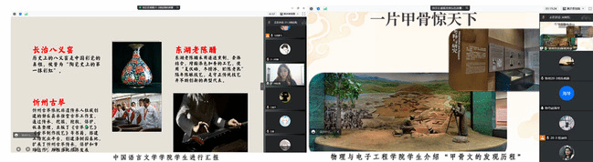 在汇报会中,历史与社会学院学生以“穿越千年赏繁华”“黄河非遗耀古今”“跨越时空为相见”“文明先声传千年”四个主题讲述了位于新疆的尼雅遗址相关故事、黄河流经九个省蕴含的历史文化、敦煌莫高窟壁画历史遗迹以及龟兹壁画等中华优秀传统文化;美术学院学生讲述非遗文化“剪纸”,号召学生增强专业传承文化的使命感;物理与电子工程学院学生讲述甲骨文的发现历程;国际文化交流学院组织学生在线参观皮影数字博物馆感受非遗魅力;中国语言文学学院学生结合古人精妙的语言艺术讲述古琴制作工艺等;音乐学院学生讲述中国民族乐器的类型和表演形式、分享国粹京剧的发展情况;地理科学与旅游学院学生讲述中国传统服饰文化;预科教育学院结合开设的《中华文化体验课》向新生介绍“泥塑”工艺;体育学院学生分享暑假期间担任枣庄市博物馆讲解志愿者的感受和成长;数学科学学院以河南卫视《唐宫夜宴》等文化巨作为切入点,讲述如何用现代技术手段让文物“活”起来,让中华文化的传承工作进一步强起来。
