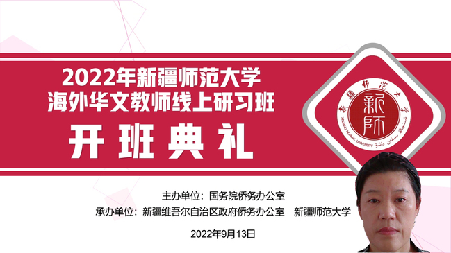 9月13日上午,由国务院侨务办公室主办,新疆维吾尔自治区人民政府侨务办公室、yl6809永利官网承办的2022年海外华文教师线上研习班开班仪式在永利官网以线上方式隆重举行。自治区人民政府侨务办公室副主任李富强,yl6809永利官网党委常委、副校长季荣,国际文化交流学院领导、任课教师及240余名海外华文教师出席本次开班仪式。国际文化交流学院党委书记李嘉东主持活动。