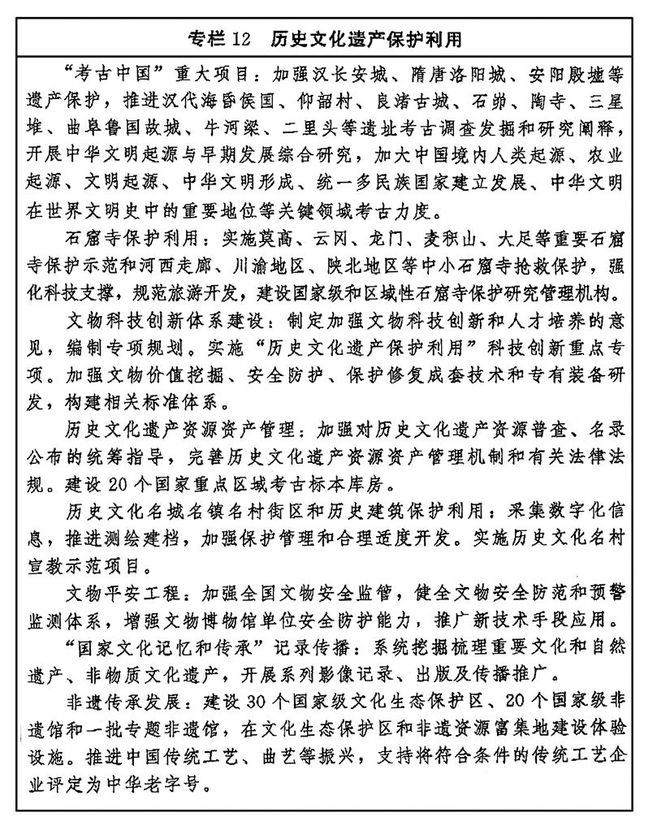 树牢保护历史文化遗产责任重大的观念,增强对历史文物的敬畏之心。全面加强考古工作,健全“先考古、后出让”制度。加强文物科技创新。统筹指导各类文物资源普查和名录公布,编制文物保护单位保护规划等专项规划,纳入国土空间规划实施。推进世界文化遗产申报、保护管理和展示宣传。加强不可移动文物和馆藏文物保护修复。加大流失文物追索返还工作力度。推进文物合理利用,建设国家考古遗址公园、文物保护利用示范区、文化遗产廊道,推介以文物资源为载体的国家文化地标和中华文明标识体系。实施中华文物全媒体传播计划。健全文物安全长效机制,严厉打击文物犯罪。