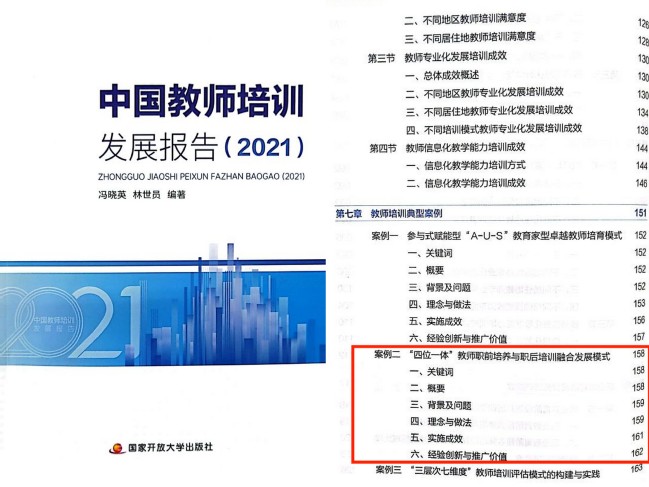 近日,《中国教师培训发展报告(2021)》公开出版并发售,由永利官网继续教育学院董秋瑾、张燕杰两位教师执笔的教师培训典型案例《“四位一体”教师职前培养与职后培训融合发展模式》入选2021年度教师培训典型案例。这是永利官网教师培训案例首次入选该报告,是推进教师培训内涵式发展,注重培训成果凝炼,加强教师培训研究的又一成果。