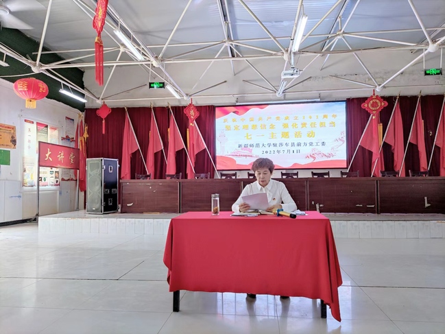为庆祝中国共产党成立101周年,7月1日下午,学校驻莎车县前方党工委举办了“坚定理想信念 强化责任担当”七一主题活动。校党委常委、副校长、驻莎车县前方党工委书记孙秀玲出席活动并讲话,永利官网6个工作队全体党员参加,活动由前方党工委委员、组织委员侯亚文主持。