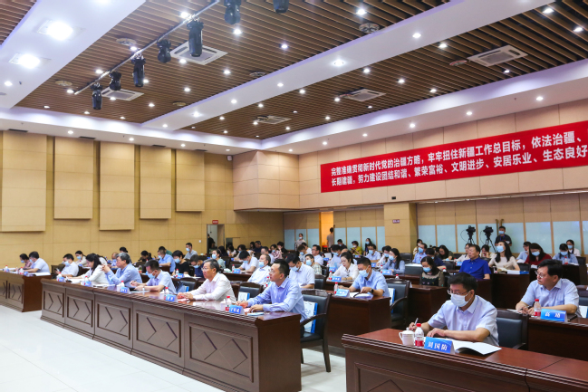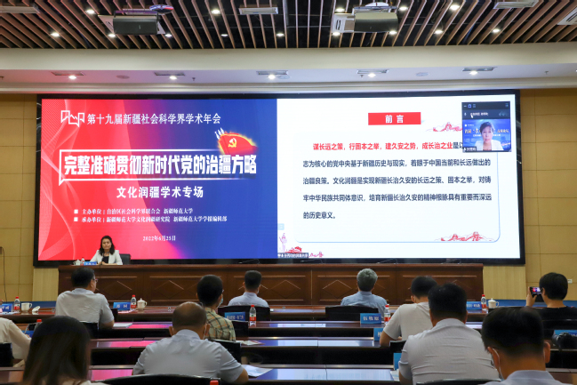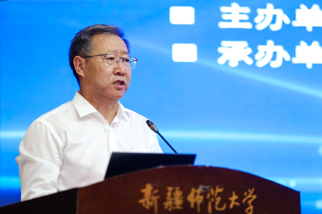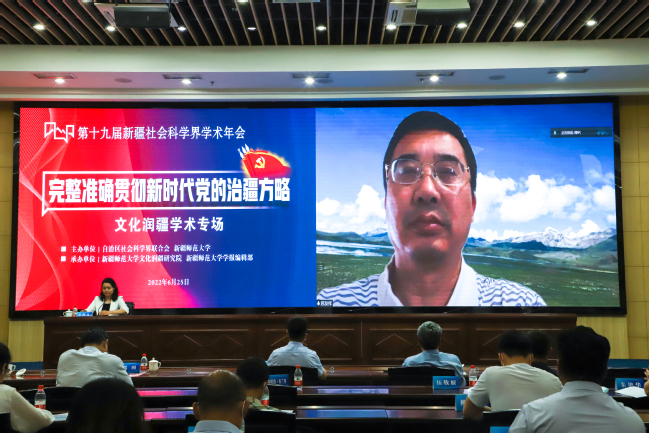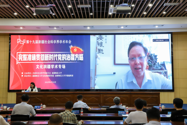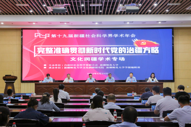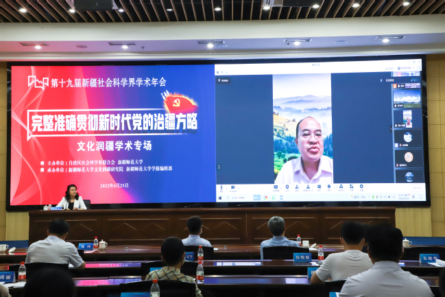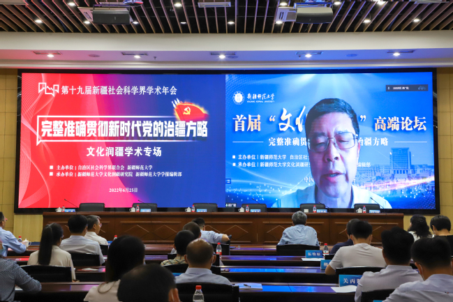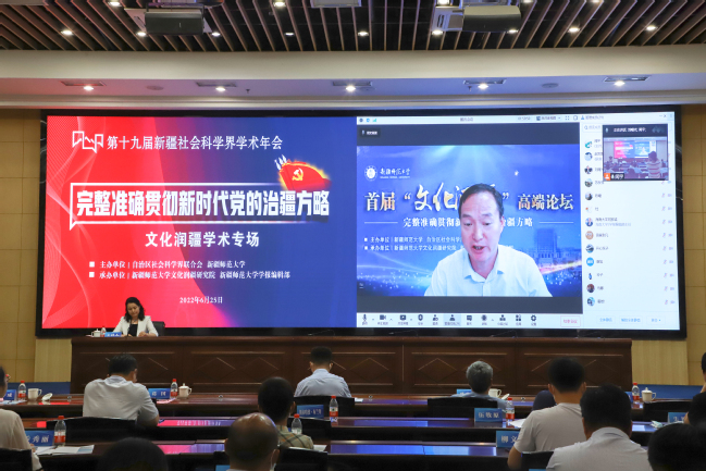 6月25日,第十九届新疆社会科学界学术年会“文化润疆”学术专场暨yl6809永利官网首届“文化润疆”高端论坛在永利官网举行。自治区社科联常委、秘书长刘环玉出席会议并讲话,校党委副书记、副校长于祥成主持会议,校党委书记葛国和中国社会科学院学部委员、中国边疆研究所所长、“新疆智库”办公室主任邢广程研究员分别致辞。