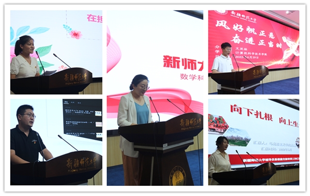 在汇报交流环节,数学科学学院党委副书记张培以《新师大小胡杨》为题分享自己从辅导员到副书记的成长之路,历史与社会学院辅导员程一祥分享赴厦门大学学习收获,计算机科学技术学院辅导员文双林分享参加自治区第九届辅导员素质能力大赛的经验和感悟,教育科学学院辅导员巴肯山、马克思主义学院辅导员陈曦结合亲身经历讲述深度扶贫故事。