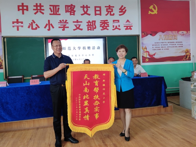 马建刚代表亚喀艾日克乡中心小学向学校赠送锦旗