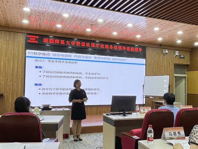 本场教学观摩课由第二届高校教师教学创新大赛新疆赛区正高组一等奖获得者、物理与电子工程学院教授张冬波主讲。她首先以“基于师范素养提升的教学设计‘1234’创新汇报”为题,从教学痛点、理念与目标、内容与设计、考评与反馈、成效与推广五个方面进行汇报,让观摩教师了解《物理课程教学论》整体课程设计。接下来以“物理课程教学策略”为授课内容进行常态课教学,课堂教学通过学生讲解、现场实验、观看视频等多种方式帮助学生掌握教学策略的实践运用方法。